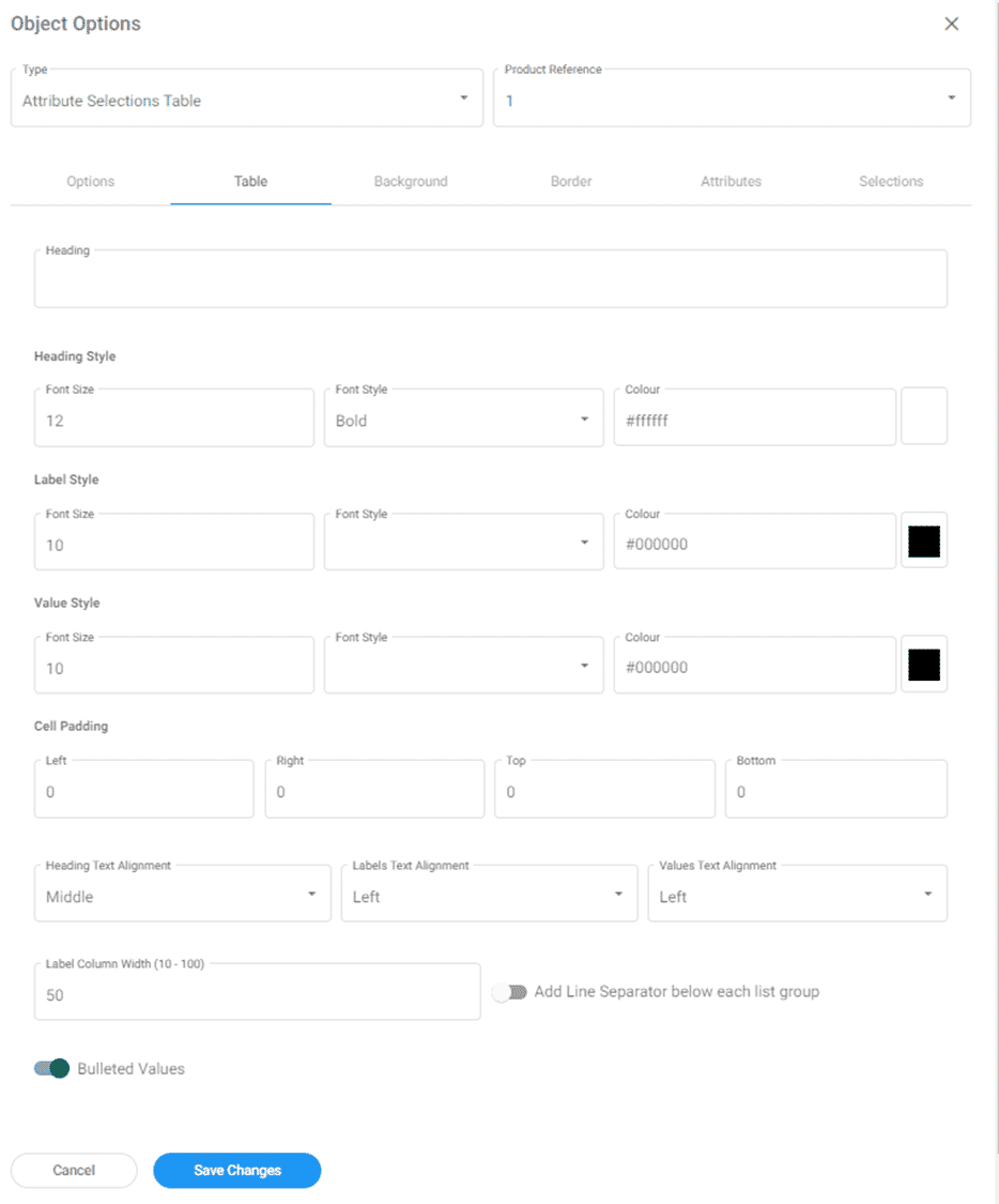 Use this object to create a list of attributes for the product you are creating a datasheet. The attributes you choose for this table can range from the dimensional data of the product to having a table listing all of the product features. The tables have many styling options allowing you to edit the font, table style/colour, to change the layout to bullet-pointed values. Many styling options help you get the most out of these tables for your designs. The table will only show the attributes that a product has populated so you won’t end up with a plethora of empty rows of useless/irrelevant data.